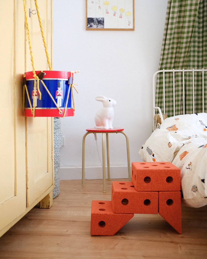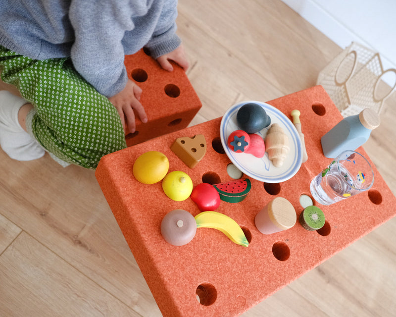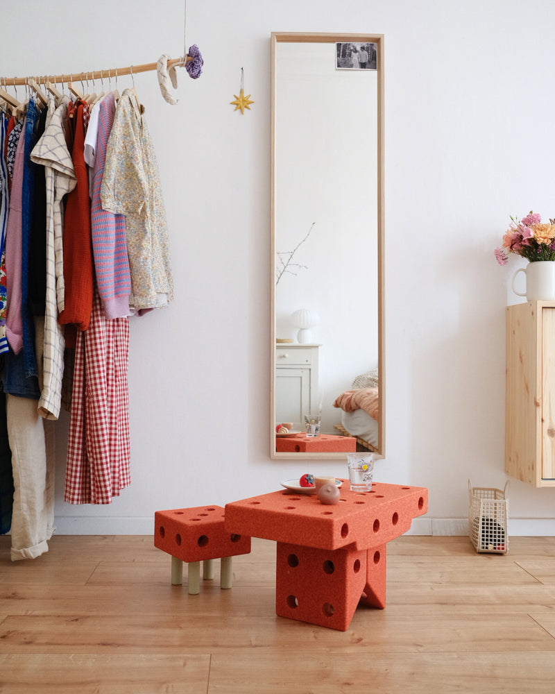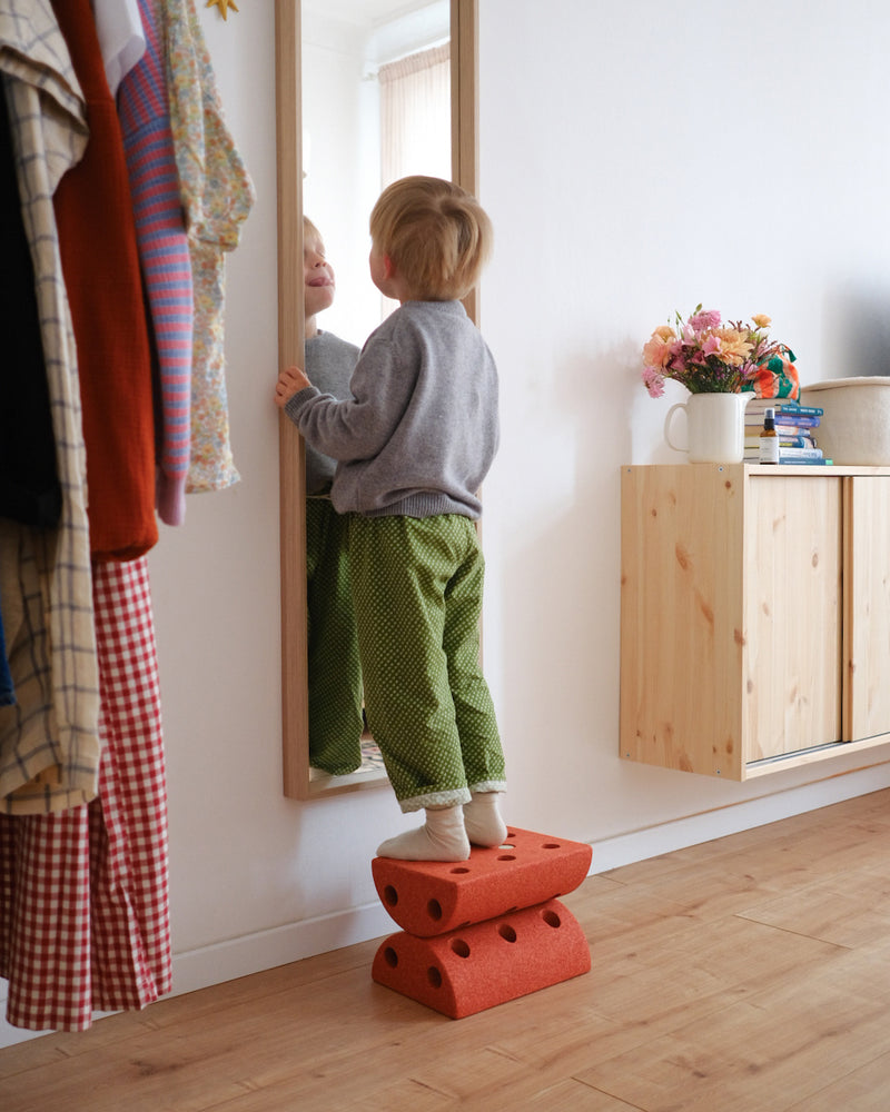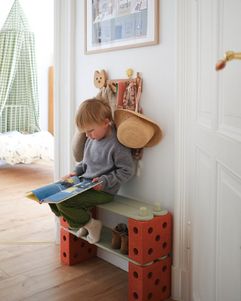 Since we have quite a few tall cabinets in the kids' room, we love building steps with MODU to help them reach things more easily. Right now, my favorite creation is a little shelf made from the new balance set. It’s sitting under the small coat rack in the hallway outside the kids’ room and works perfectly as a shoe rack and storage, plus it helps the kids with getting dressed on their own. And of course, the all-time favorite for our youngest is the table and chairs—he’s always sitting there drawing or "inviting" us to join him for a little meal.